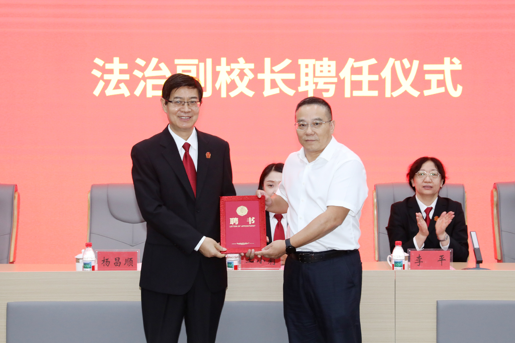 聘任仪式上,姜堰中学校长游忠为杨昌顺院长颁发法治副校长聘书。