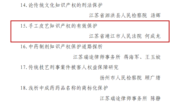 靖江法院何成龙撰写的《手工皮艺知识产权的有效保护》喜获优秀奖