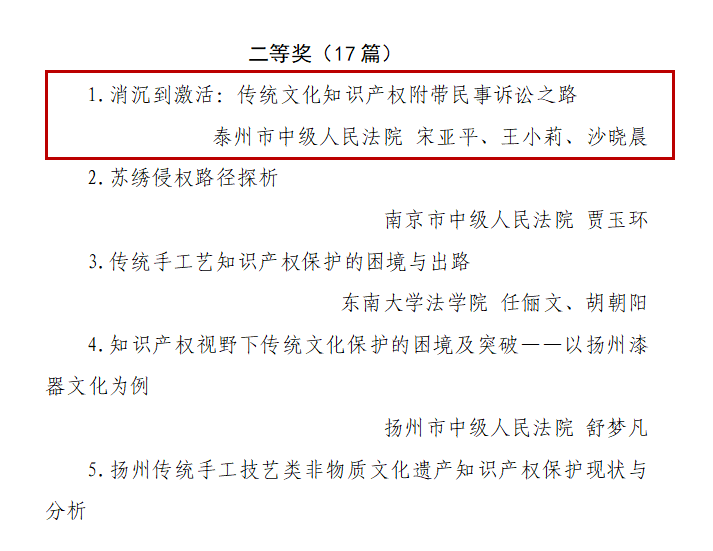 本次江苏省法学会知识产权法学研究会以“传统文化的知识产权保护”为主题向社会公开征集年会论文,泰州法院高度重视、广泛动员、积极准备、精心撰写,共申报四篇论文,获奖三篇论文。
