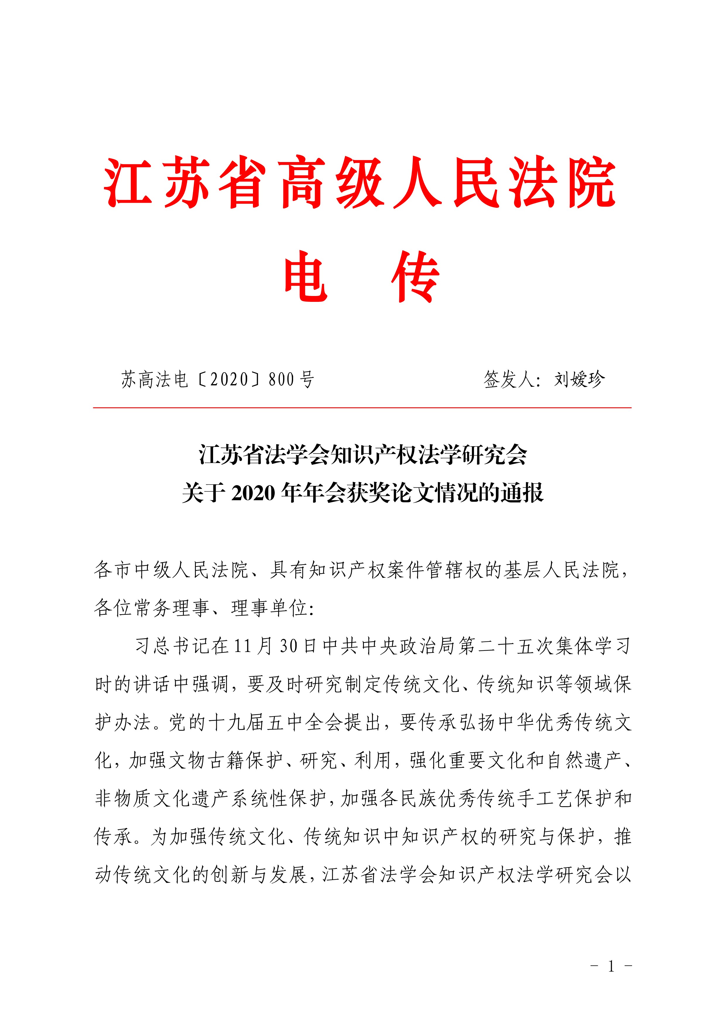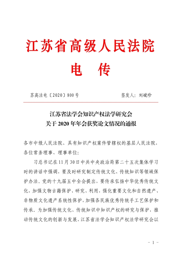 近日,江苏省法学会知识产权法学研究会发布了《关于2020年年会获奖论文情况的通报》,泰州法院共有三篇论文喜获年会优秀论文。