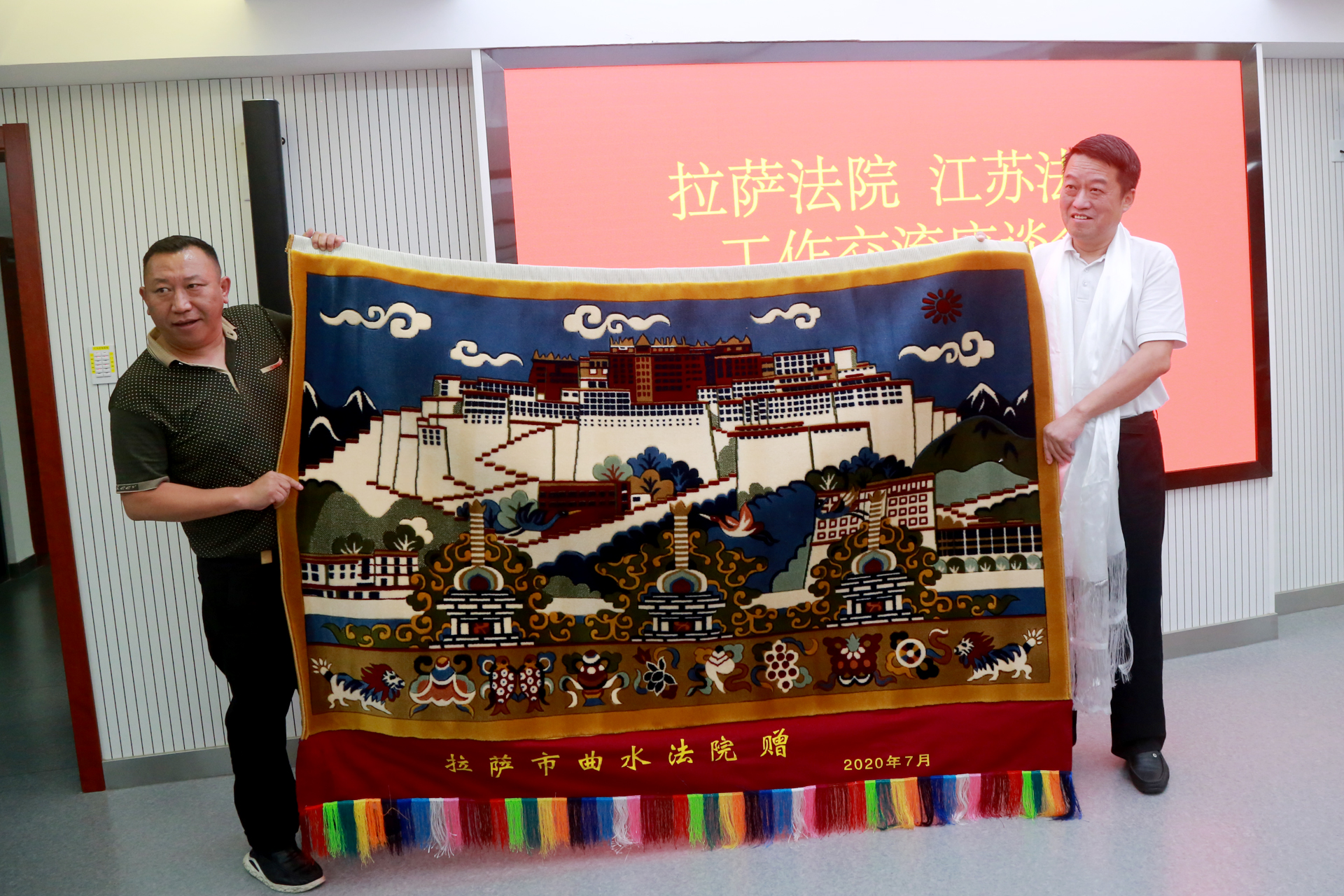 哈达送祝福,画卷彰情谊。7月21日,在江苏高院副巡视员赵利国、两援办副主任赵冰清的陪同下,拉萨中院党组书记、院长李世蓉一行来到泰州法院考察交流。泰州中院党组副书记、副院长纪阿林,党组成员、副院长宋亚平等陪同并作交流。