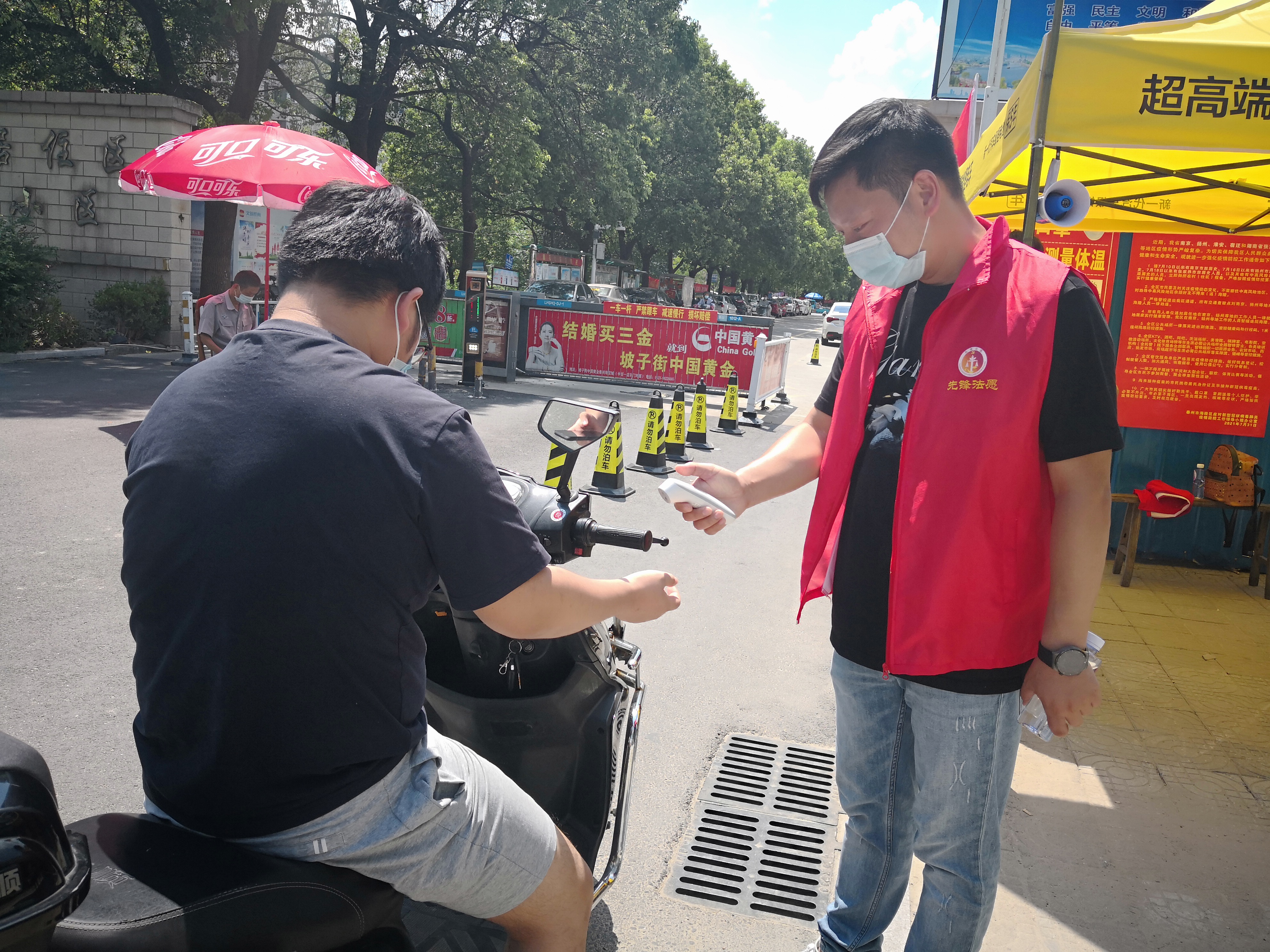 持续高温没有影响大家的服务热情,志愿者们带着口罩、面罩、手套等防护装备,脸上、手上、身上全是汗水。但是他们毫无怨言,一遍又一遍重复着单一而又不简单的工作,守护着公路、社区的大门,充分展现了法院青年干警热血依旧、迎难而上、能当大任的拼搏和奉献精神。