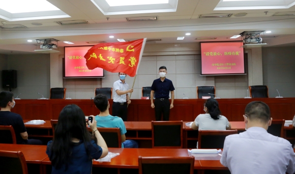 面对新冠肺炎疫情的严峻复杂形势,市中院向全体青年干警发起了“四倡导四争当”的倡议。倡议发出后,市中院青年干警争相报名、踊跃参加,8月5日下午,市中院成立“青年干警突击队”并举行授旗仪式,说明了疫情防控志愿服务的注意事项。
