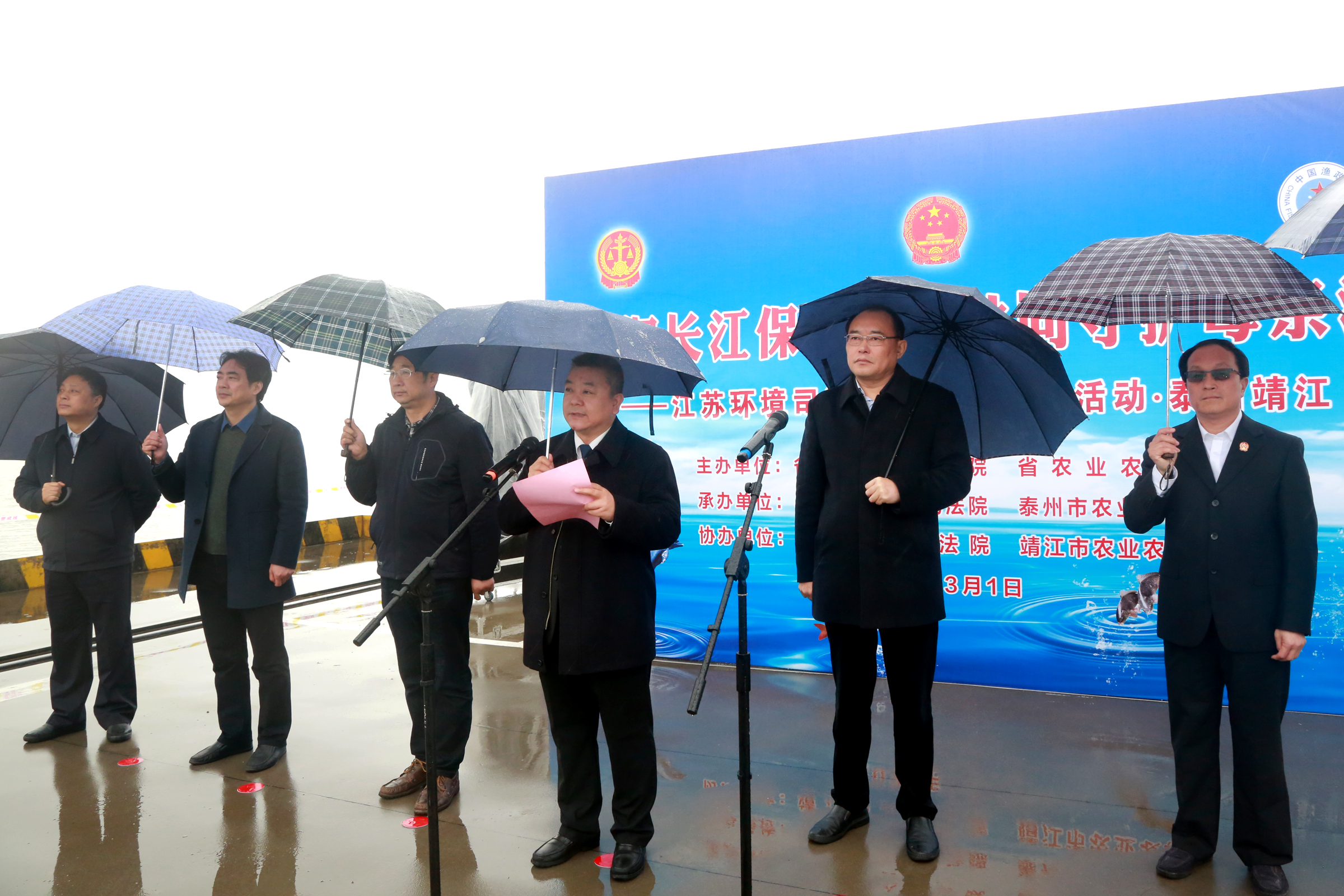 泰州市中级人民法院党组成员、审委会专职委员陈富贵,泰州市农业农村局副局长缪玉江,泰州市生态环境局副局长吴建伟,靖江市市委常委、政法委书记何卫东,靖江市人民法院院长许飞、靖江市农业农村局局长陈焕新参加本次活动。泰州市和靖江市法院、农业农村局等部门,以及渔民、志愿者等100多人参加此次放流活动。