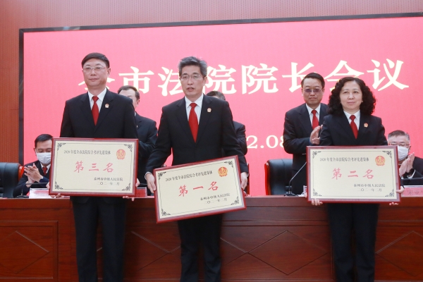 会上还举行了基层法院2020年度“双考”“双评”颁奖及“天平”纪念章颁授仪式;进行了泰州市法学会审判理论研究会选举。会议通过视频方式召开,市中院领导班子成员、各部门主要负责人、各基层法院院长、获得“天平”纪念章的干警代表在主会场参会;各基层法院领导班子成员、各部门主要负责人在分会场参会。