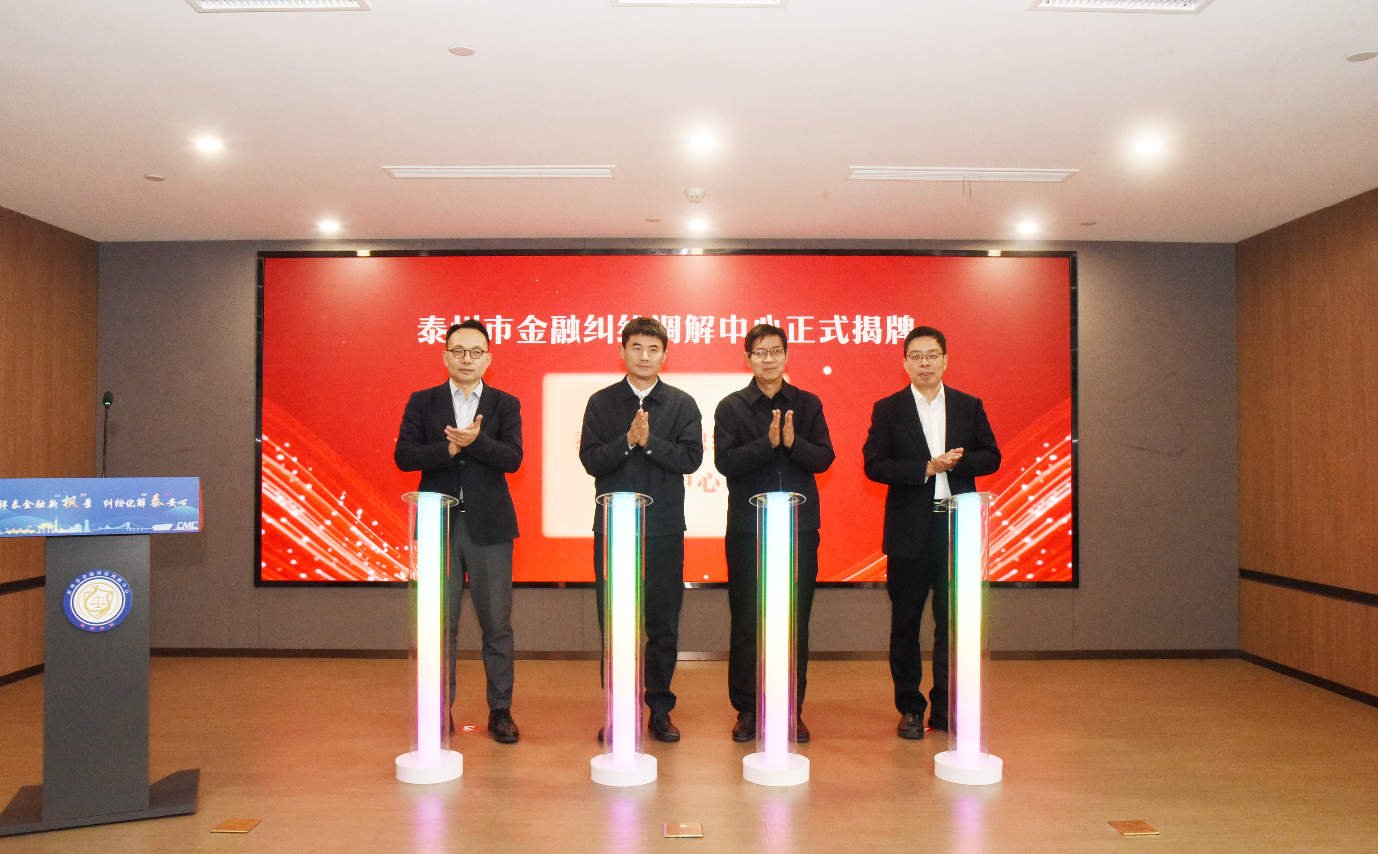 陈力副市长、杨昌顺院长、韩潮副秘书长、蒋汉春局长共同为“泰州市金融纠纷调解中心”揭牌。