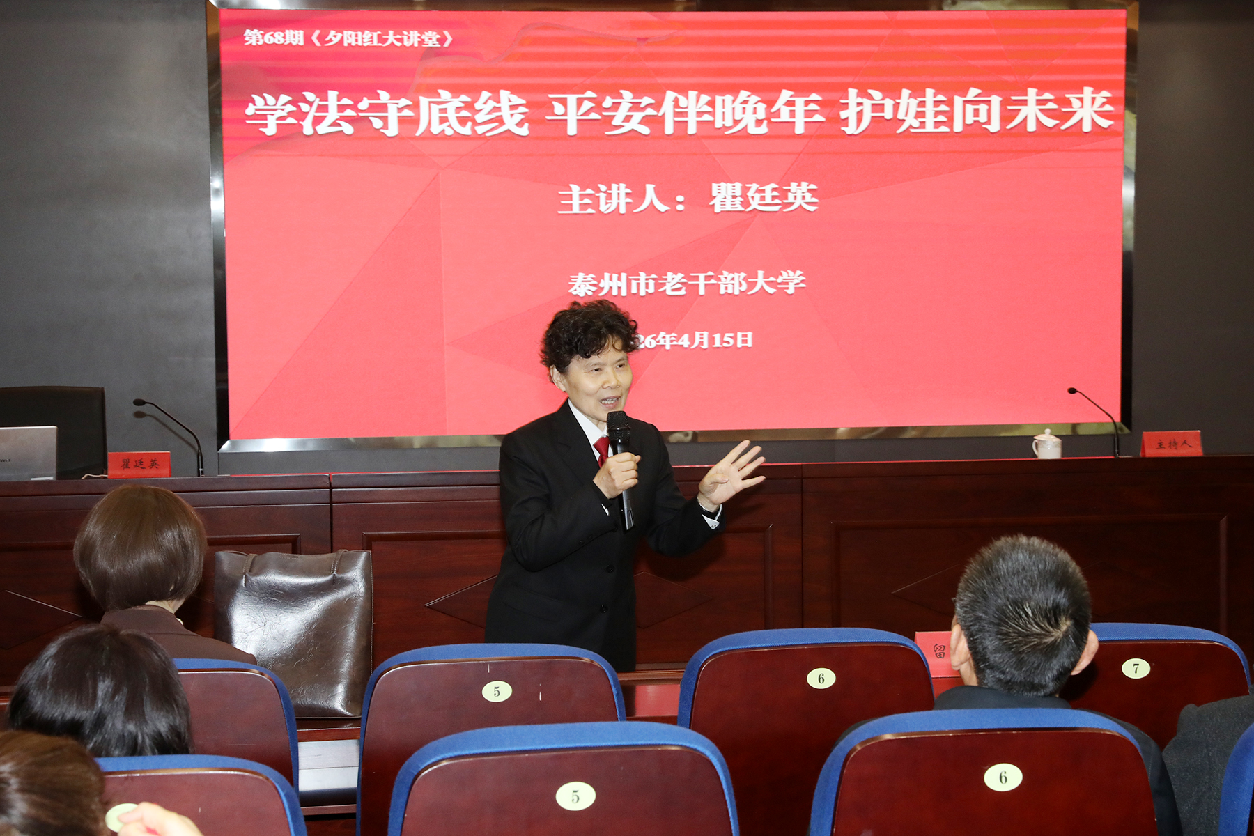 为进一步提升全市离退休干部法治素养,强化晚年生活安全防范意识,筑牢未成年人家庭保护防线,4月15日上午,泰州市中级人民法院关工委举办专题法治讲座,关工委副主任瞿廷英以“学法守底线,平安度晚年 护娃向未来”为主题,为全市100多位离退休干部送上一堂贴近生活、通俗易懂的法治课。